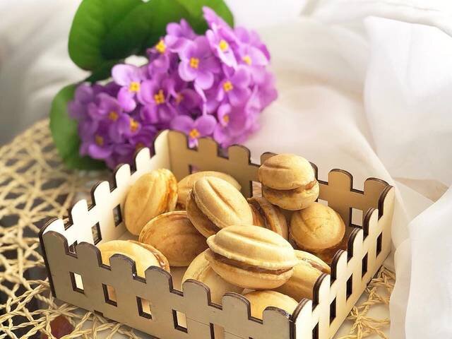 Разогреваем орешницу, выкладываем шарики и печём до золотистого цвета. Сразу, как вынимаем половинки, обрезаем лишнее, формируя ровные орешки. Делать это нудно сразу, т.к. тесто быстро твердеет. Каждую половинку начиняем варёной сгущёнкой, соединяем-готово! Орешки вкусно как с молоком так же и с горячим чаем