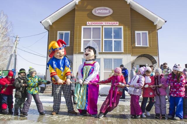 Вот и наша первая зима в Удачном подошла к концу. Солнышко стало пригревать и светить чуть ярче. Пора зимушку провожать и встречать весну-красну. Администрация нашего поселка решила нам устроить проводы зимы. Ура! Масленица! Даша с раннего утра в нетерпении, когда же когда уже пойдем на праздник. Конечно этот праздник устраивают больше для ребятни, чем для взрослых. И вот час настал, и мы отправились на площадь, где предстояли нам разнообразные игры, потешки, где уже звучала веселая заводная музыка и куда подтягивались взрослые со своими чадами. Приглашенные артисты в костюмах развлекали маленьких зрителей, проводили конкурсы и подвижные игры. В другом конце площади детишек катали на Хаски. Это такие красивые голубоглазые собачки, запряженные в сани. В эти сани садили ребенка, закутывали его в специальный комбинезон, прикрепленный к саням, чтобы он невзначай не вывалился, и погонщики разгоняли собачьи упряжки из одного конца улицы в другой конец и обратно. А следующий в очереди с н