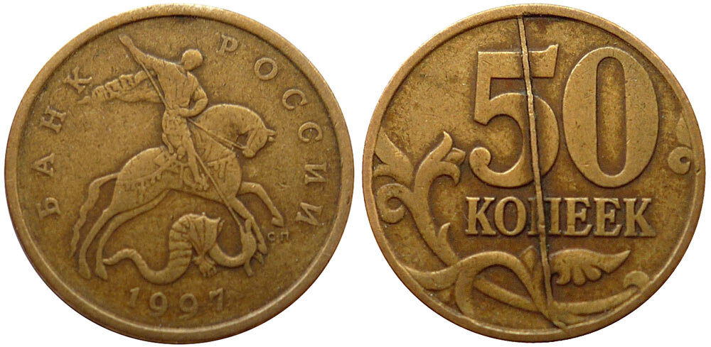 Вот номинал 50 копеек. Если на стороне полный раскол – цена такого экземпляра может быть более 1000 рублей. Как происходит раскол штемпеля? Связано это с тем, что на чеканящие штемпели воздействуют серьезные механические нагрузки. Если штемпель недостаточно закален, могут возникать дефекты. Чаще всего встречается раскол, как разновидность брака. На всем поле монеты образуется выпуклая линия. От канта и берет свое начало трещина на штемпеле. Как выглядит раскол на монетах номиналом 1 рубль. Цена каждой более 3.000 рублей. Если раскол полный, то линия должна пройти в монете от канта до канта. Есть и частичный раскол. В этом случае штемпель, который треснул, всю монету прочеканил. Пресс давит на заготовку, и металл расползается в трещины. Так, на поверхности монеты получается рельефная выпуклость. Довольно популярны глубокие расколы. Это – когда бороздка толстая, и ярко выражена. Если встречаются обычные расколы, они не имеют ценности. Эти моменты дальше пускают в оборот.