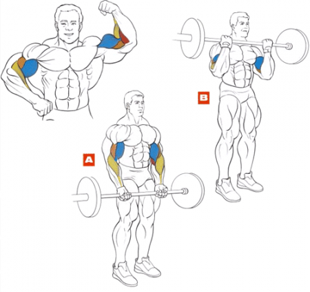 Подъем штанги на бицепс стоя – это упражнение, которое увеличивает массу бицепса, оно помогает задействовать плече-лучевую мышцу предплечья. Как правильно выполнять технику подъема штанги на бицепс Необходимо встать прямо, расставив ноги на уровне плеч. Стопы должны находиться параллельно друг другу, а носки направлены немного в стороны. Штангу необходимо взять хватом снизу, ладони при этом направлены вверх и находятся, по ширине, чуть шире плеч. Полностью распрямитесь и немного прогнитесь в районе поясницы, опустив штангу к бедрам. При этом необходимо смотреть строго вперед. При подъеме штанги на бицепс стоя, мышцы поясницы, как правило, должны быть напряжены, позвоночник зафиксирован в его естественном положении до самого конца упражнения. Чтобы сет прошел результативно глубоко вдохните, согнув руки в локтях, и не надолго задержите дыхание. В это время поднимаете штангу до самого верха груди. При поднятии штанги запрещено двигать локтями, их требуется держать по бокам туловища,