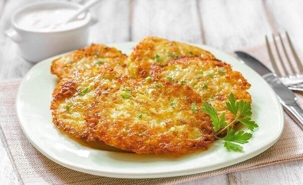 Картофельные оладьи, драники или деруны, встречаются в национальных кухнях европейских народов. Поджаренные лепешки из картофеля любят и в Латинской Америке, и в Скандинавских странах. А в Белоруссии драники с мясом или колдуны являются самым любимым и почитаемым блюдом. Начинающим домохозяйкам будет полезно освоить этот простой рецепт картофельных дранников. Ингредиенты: Картофель — 6 шт. Лук репчатый — 1 шт. Ветчина — 200 г Сыр твердый — 200 г Яйцо — 2 шт. Укроп (мелко нарезанный) — 1-2 ст. л. Мука — 4-5 ст. л. Соль — по вкусу Перец черный молотый — по вкусу Масло рафинированное (для жарки) — 3-4 ст. л. Способ приготовления: Подготовить продукты, почистить картошку, лучок, порезать мелко укроп. Натереть на крупной терке все ингредиенты: картофель, сыр, ветчину, лук. По вкусу добавить соль, черный молотый перец. Добавить сырые яйца, укроп, муку, и старательно все это перемешать. Наша субстанция приготовлена к жарке. Масло разогреть на сковородке. В к