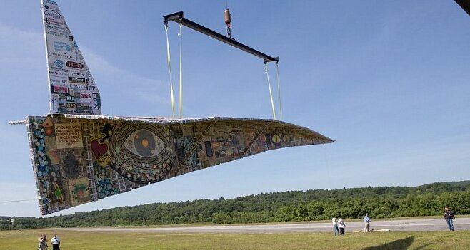 Оригинал статьи: http://21mm.ru/blog-polzovatelya/dnevnik/mashiny_mekhanizmy/ulybka/samyy-bolshoy-v-mire-bumazhnyy-samolet/ Чтобы создать и поднять в воздух такой огромный самолет, потребовалось 4 года, 4500 людей и помощь сотрудников аэропорта 4500 добровольцев создали бумажный самолет массой 680 кг за четыре года. Изначальная идея принадлежит художнице и арт-директору музея Джерри Бек — они хотела побить рекорд книги Гиннесса, объединить людей и дать им возможность самореализации. Построить огромный самолет захотело очень много людей, поэтому пришлось увеличивать его размеры. Вместо планируемых 15 метров арт-объект достиг длины 19,5 метра. На каркас из бамбука и гофрированного картона люди укрепляли рисунки, коллажи, оригами, фотографии и любые творческие поделки на основе бумаги В запуске самолета помогли сотрудники Массачусетского музея и городского аэропорта. На глазах у толпы и представителей Книги рекордов самолет оторвался от земли при помощи подъемного крана. Подписы