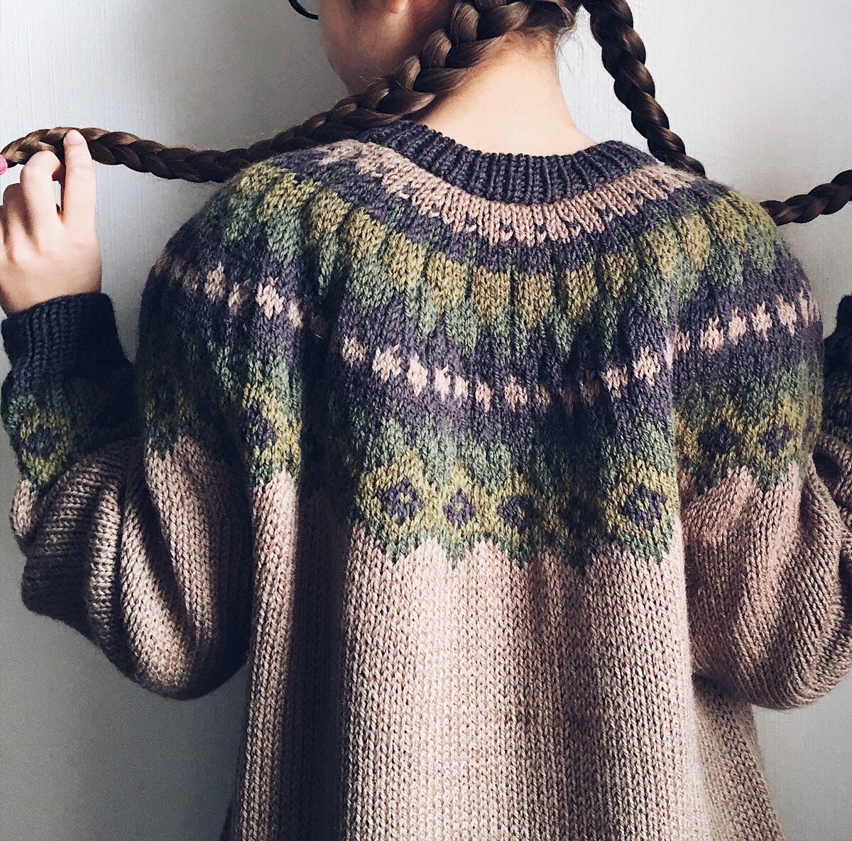 Про росток, жаккардовую кокетку и горловину. Росток. Та самая разница в высоте между передом и спинкой, призванная обеспечить нормальную посадку на наши человеческие туловища. Я вяжу росток перед тем как перейти к узору на кокетке. Чтобы сделать заднюю часть выше передней, используем укорочённые ряды. У меня в работе 80 петель спинки и по 56 петель рукавов. Разделим петли рукавов на равные части: 8+8+8+8+8+80+8+8+8+8+8. С каждым провязанным рядом я буду захватывать по 8 петель каждого рукава. Я использовала только 40 петель каждого рукава и всего провязала 10 рядов, что соответствует 5,5 см. Это стандартный размер ростка для взрослого свитера. ~ После того как рукава присоединили к телу и связали росток, начинается самое увлекательное! Вязание кокетки можно раз делить на два этапа: 😦Какой ужас! Свитер получился огромным! 😧Какой ужас! Горловина получилась узкой! Или широкой?! К обоим этапам добавим перманентное - «какой ужас! Почему все такое скукоженное?!»🤭 Первый этап объясняется