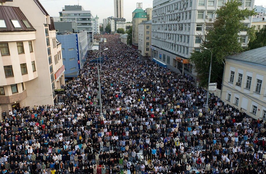 Люблю баранину, не знаю, откуда у меня эта любовь к Харчу, шашлыку и супчику с бараниной, вроде, в роду все почти русские. Зашла за мясом в халяльный магазин, есть у нас такой при рынке, торгуют настоящие мусульмане, женщины в платках, все как положено. В магазине два отдела- с колбасой и мясом, а второй-выпечка. Пирожки , чак-чак и тортики, все вкусно и относительно недорого, поэтому всегда в отделе пирожков много народа независимо от национальности. Покупаю баранину, а передо мной мужчина-мусульманин взял 8 килограмм фарша. Я еще так удивилась, ну думаю, наверно, семья большая, иначе куда ему столько. А сегодня выхожу из метро, ешки-матрешки, праздник оказывается, Ураза-Байрам (праздник Разоговения) после поста Рамадан. Месяц люди днем ничего не кушают, лишь по ночам..Вот теперь праздник живота сегодня у них,. Я несколько лет работаю относительно недалеко от мечети и каждый раз, выходя из метро 15 июня, не могу привыкнуть к толпе народа. Каждый раз шок, бывает иногда столько народа,