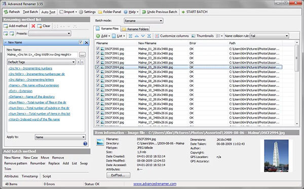 Работа с большим количеством файлов всегда занимает много времени и в большинстве своём однотипная а иногда даже и нудная. Особенно это касается тогда, когда надо переименовать большое количество различных файлов. В данном случае может помочь программа для массового переименования файлов Advanced Renamer. Данная программа позволяет избавится от рутинной работы и делает массовое переименование музыкальных, текстовых и других файлов. Так же при помощи Advanced Renamer, можно редактирования теги MP3 файлов и массово переименовать целые папки с назначением новых имён. При работе с файлами понадобится выбрать метод переименования, указав как будет добавлять следующее имя файла или папки, это может быть, как увеличивающееся число так и буква для следующих друг за другом папок или для файлов. В общем программа для переименования файлов Advanced Renamer, может очень упростить и ускорить работу с файлами или папками которые надо переименовать в большом количестве за ограниченное время. Распро