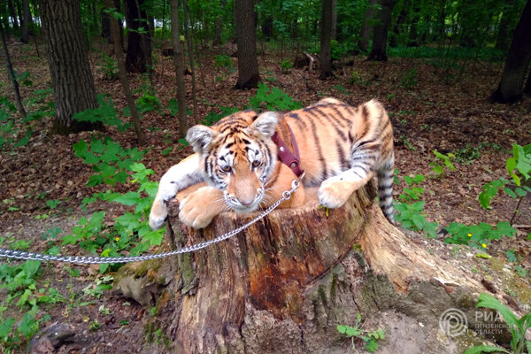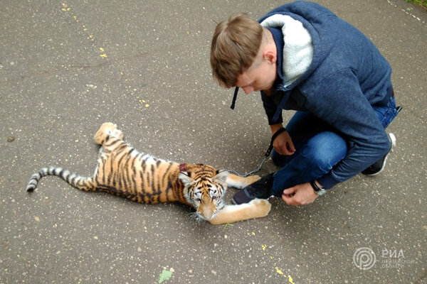 - Это хищник. Это то животное, которые вырастет 200-250 кг. Когда он вырастет таким, ему уже по носу не настучишь. Если она тебя обнимет не вовремя, ты упадешь, можешь удариться. Если тигра сейчас не воспитывать в условной строгости, может случиться непоправимое. Оговорюсь, не в жестокости, а в условной строгости, - это две разные вещи – нельзя ей позволять делать все, что она хочет. Если мы играем, то там ей можно делать все, что она хочет. Если мы идем, как сейчас, на прогулке – что-то делать ей нельзя.