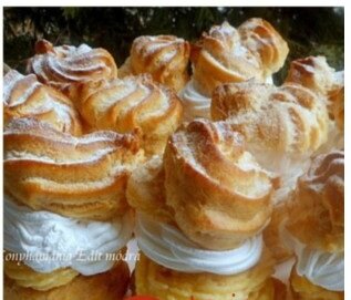 Божественные пирожные из простых продуктов, нежное и мгновенно тающее во рту,!!! Красота и легкость в приготовлении. Аппетитный золотистый цвет! Не возможно оторваться! 2 стакана муки 2 стакана воды 250 гр. жира (масло, маргарин) Щепотка соли 9 яиц Крем: Сливки (33%)- 1 л. 150 гр. сах. пудры 2 пак. желатина В кастрюлю вливаем воду , добавляем маргарин, и соль, ставим на огонь и ждем когда закипит, затем всыпаем муку и при непрерывном, интенсивном помешивании вымешиваем однородное тесто, которое не прилипает к стенкам кастрюли. Даем слегка остыть, а затем в массу один за другим вводим яйца. Наполняем тестом кондитерский мешок, и на застеленный пекарской бумагой противень отсаживаем маленькие пирожные в форме купола. Выпекать при t -200* – время выпечки зависит от размера, но я пеку минут 15-20. Главное не открывать духовку. В противном случае, тесто падает. Крем: Взбиваем сливки до устойчивого состояния, и постепенно вводим сах. пудру, затем добавляем разбавленный желатин (