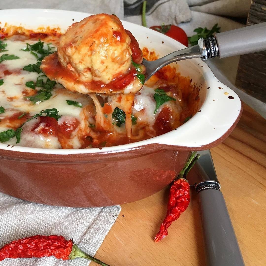 Ингредиенты: 500 грамм фарша куриного 1 перепелиное яйцо Гречка вареная ~ 4 ст.л. Зелень (укроп/петрушка) Для соуса, а-ля Долмио: 3 помидора 1 красный перец Томатная паста Специи Петрушка Моцарела Приготовление: Смешиваем фарш, яйцо, порезанную мелко зелень и отварную гречку, скатываем небольшие шарики. Шарики выкладываем в форму для запекания, немного вливаем воды, что бы на пару мм покрыть дно формы. Далее готовим соус - очищаем помидор от кожуры, режем на небольшие кусочки, режем перец. Обжариваем пару минут на сковроде помидоры и перец, солим, перчим, добавляем специи, зелень, заливаем 1 стаканом воды и таматной пастой, тушим минут 10, получается а-ля Долмио. Далее заливаем наши тефтельки этим томатным соусом, ставим в разогретую на 180 духовку на 40 минут, вынимаем из духовки, посыпаем тертой моцареллой и еще на 5 минут в духовку. Достаем и наслаждаемся чудесным вкусом! Приятного аппетита!