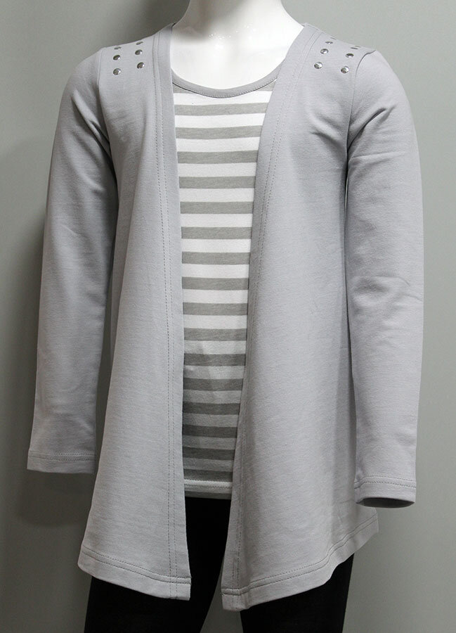 Стильный кардиган серого цвета, так же у него имеется вставка в полоску под "майку" Да-да это просто вставка - обманка, а не майка как можно подумать. Достаточно смелое решение от дизайнеров LeadGen. Ткань - футер двунитка, качественная, приятная телу. Очень достойная модель для девочки. Подробнее познакомиться с данной моделью или фирмой можно тут