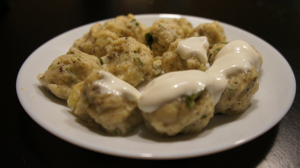 12. Готовые колобки подаем со сметаной или белым соусом из сметаны, майонеза и чеснока.