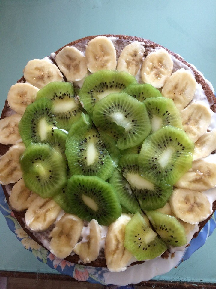 Но можно и самим испечь, гуглите рецепты. Разводим кофе, даём чуть остыть. Кладём первый корж, пропитываем кофе. Выкладываем сыр и распределяем по всей поверхности коржа. Тоненько режем киви и банан, выкладываем как кто хочет.(у меня по краям бананы кругляшками, а в центре киви). Повторяем это же и со следующими коржами. Торт готов.