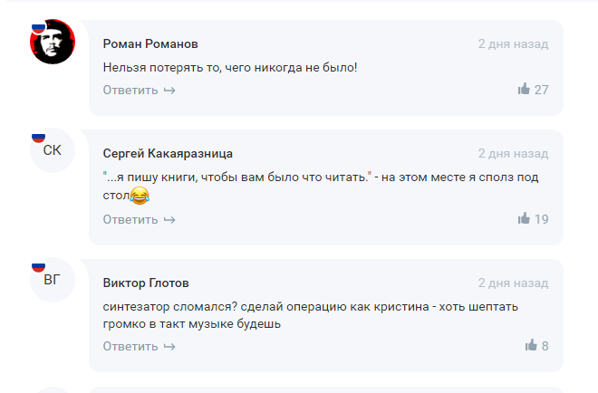 32-летняя Ольга Бузова сорвала голос. Об этом поп-певица сообщила в Instagram Stories, а в одном из постов в микроблоге отметила, что «можно услышать много интересного, если замолчать». Сразу появились первые комментарии от "поклонников" Голос знаменитости в течение последних суток сильно изменился. Ольга сообщала, что ей сложно говорить. Звезда также не помнит, когда в последний раз нормально отдыхала. "Плохо спала и вообще не помню, когда я спала и высыпалась. Верните мне голос. Как быстро вернуть его? Чай, наверно, горячий", — делилась Ольга. Исполнительница призналась, что пытается исправить проблему, используя советы своих подписчиков: Пью теплую воду, молочко, чай, но пока еще голос слабенький. До потери голоса Бузова выступила на открытии своего ресторана в Москве. Посетители, к слову, устроили давку, пытаясь попасть в заведение, и парализовали автомобильное движение на Цветном бульваре, где расположен ресторан. "Я создаю музыку, чтобы вам было что слушать, я создаю хор