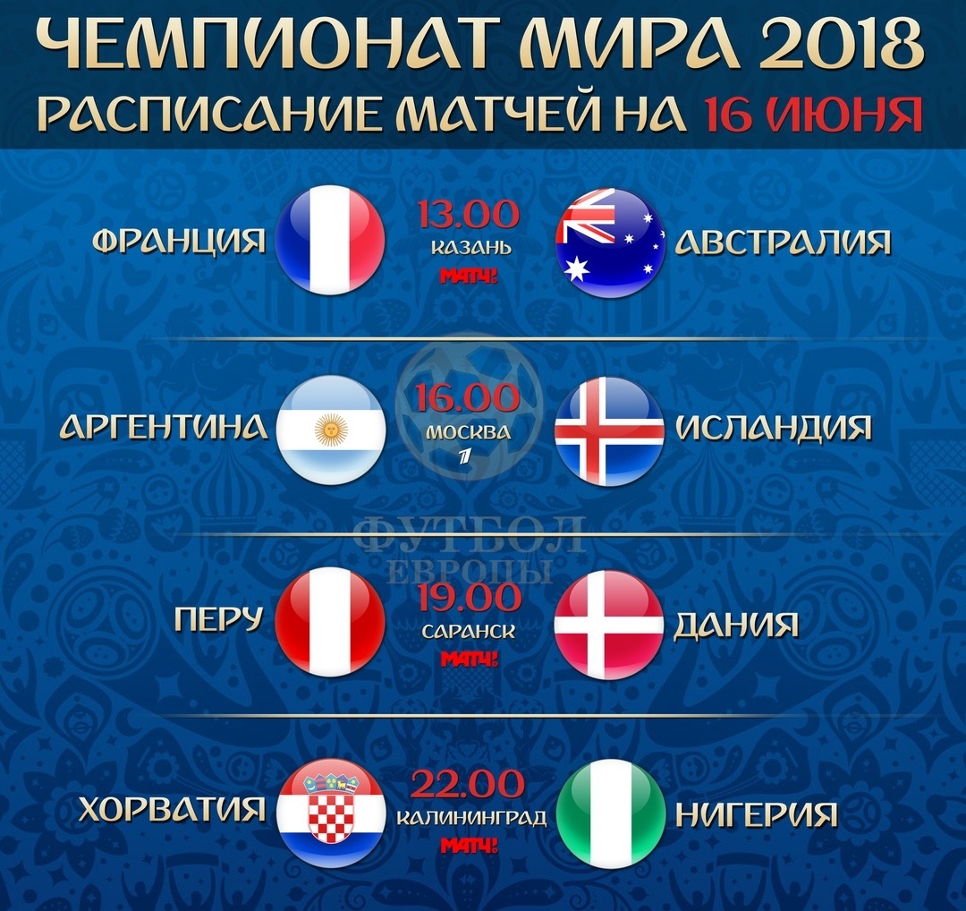 Чемпионат мира по футболу набирает свои обороты, и сегодня, 16 июня, состоятся очередные матчи первенства. Сегодня встреч будет четыре: игры пройдут в Москве, Казани, Саранске и Калининграде. Прямые трансляции матчей организовывают для болельщиков телеканалы Матч! и Первый канал. Итак, в 13:00 стартует поединок между сборными Франции и Австралии.
