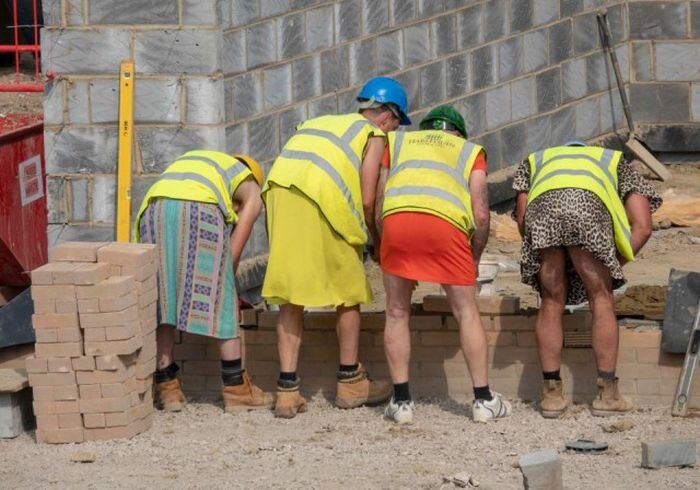 В Великобритании строители пришли на работу в платьях и юбках ! В британском городе Чертси, графство Суррей, строители вышли на работу в весьма необычных нарядах. Они надели юбки и платья и в таком виде занимались своими обычными делами. Все это было вызвано сильной жарой и техникой безопасности, которая запрещает ношение шорт. Правила гендерного равенства не запрещают ношение женской одежды на строительной площадке.