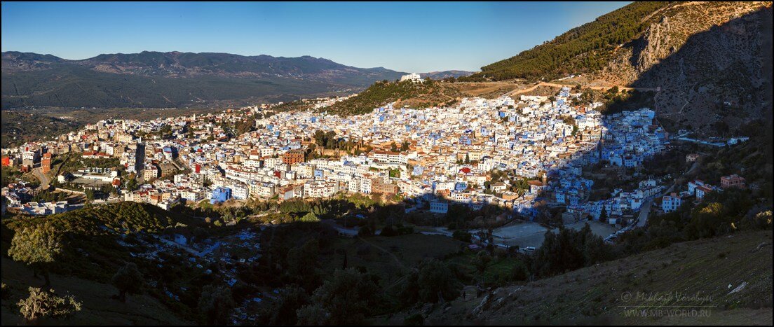 Об этом месте я узнал в 2012 году, готовясь к нашему первому путешествию в Марокко. Я хорошо помню, как увидев в сети фотографии ярко синих тонов, первым делом подумал о техническом браке и нарушении цветового баланса. Слишком необычно они выглядели. Однако, побывав в синем городе дважды, я убедился, что это удивительное место существует в реальности… Итак, Шефшауэн – знаменитый синий город, расположенный среди пологих склонов Рифовых гор на севере Марокко. Город, прежде всего, известен своей исторической частью — мединой, где стены домов, окрашенные насыщенными холодными оттенками синего, гармонично сочетаются c теплыми оранжевыми тонами крыш, лестниц и других элементов декора. Здесь можно бродить часами, наслаждаясь цветовой палитрой и размеренной атмосферой… История города начинается в 1471 году, когда эмир Моула Али-бен-Мусса-бен-Рашид-эль-Алами основал на месте небольшой берберской деревни первую мечеть и мощную крепость для защиты от португальских захватчиков, которые закрепил