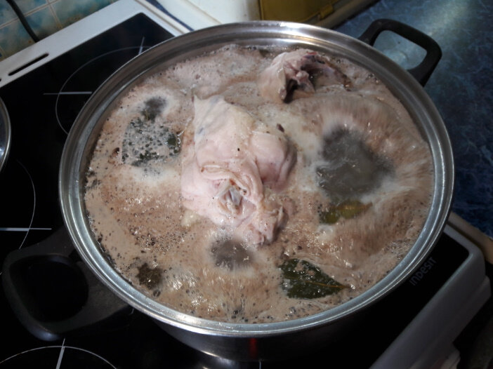 Здравствуйте дорогие читатели, сегодня мы вместе с вами будем готовить вкусный холодец на курийнных грудках, для этого нам понадобятся: 1) Куринные грудки 5-6 шт 2) 2-3 головки чеснока (по вкусу) 3) Желатин (столько, сколько потребуется) 4) Лавровый лист (2-3 шт) 5) Соль , Перец (по вкусу) , можно добавить вместо соли приправку Ролтон ;) Как обычно наливаем в кастрюлю воды, выкладываем грудки, и варим 2 - 2,5 часа!, не забудьте кинуть лавровый лист и подсолить и поперчить по вкусу! Далее нам нужно будет снимать пенку, снимаем пенку и продолжаем варить ) Спустя 2 - 2,5 часа вынимаем грудки в ёмкость и даем остыть Пока грудинки остывают, чистим чеснок Когда мясо остыло, начинаем его перебирать в ёмкости или ёмкость для холодца Мясо перебрали!?, молодцы, теперь нам нужно добавить чеснока, поперчить и подсолить (по вкусу) Теперь высыпаем желатин в бульон, при этом тщательно все мешая! Когда хорошенько перемешали желатин, выливаем бульон в ёмкость (ёмкости) для нашего с вами будущег