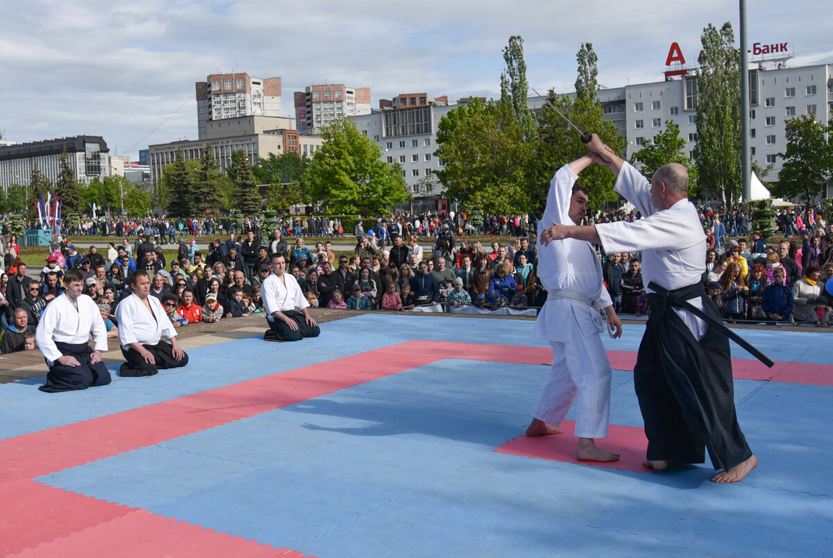 На прошедших выступлениях на фестивале боевых искусств инструктор клуба "Анъюкай-Пермь" Борис Анатольевич Мокрополов (4 дан Айкидо Айкикай) показывал техники с использованием японской катаны. В обычном тренировочном процессе в айкидо используется боккен. Деревянный "муляж" японского меча. [Муляж написан в кавычках, так-как это всё равно грозное оружие в умелых руках. Поинтересуйтесь, к примеру, историей Миямото Мусаси] Но для фестиваля была выбрана катана. С одной стороны для эффектности, а с другой, чтобы потренироваться в таких сложных условиях как фестиваль. Не все демонстрируемые техники - это Айкидо. В начале, до показа приемов в паре, показываются движения из Иайдо, японского искусства обращения с катаной, которым Борис Анатольевич овладевает в последнее время. P.S.: Подписывайтесь на канал и ставьте лайк, если хотите быть в "теме". Предыдущий выпуск здесь До встречи. Аригато!