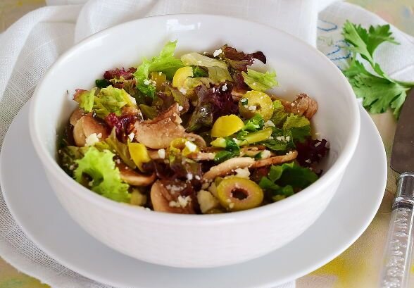 Хочешь много интересных рецептов, тогда скорее подписывайся на наш канал и смотри наши публикации. Впереди еще много интересного! Ингредиенты: Оливки - 100 г Шампиньоны - 100 г Салатный микс - 50 г Масло оливковое - 1 ст. ложка Брынза - 50 г Приготовление: 1. Оливки нарезаем колечками (жидкость слейте в отдельную миску, не выливайте) 2. Шампиньоны промыть, просушить и нарезать пластинками или на ваше усмотрение 3. Шампиньоны необходимо замариновать в соусе от оливок на 20 минут 4. Листья салата как обычно промываем и сушим. Затем необходимо нарвать в салатницу 5. Добавляем в Салатницу грибы, жидкость сливаем 6. Теперь добавляем оливки 7. Сверху посыпаем сыром. можете нарезать произвольно 8. Заправляем оливковым маслом. Перемешиваем Наш салат готов. Приятного аппетита:) Если Вам нравятся наши рецепты ставим ЛАЙК и подписываемся наканал. СРЕДСТВА ДЛЯ ПОХУДЕНИЯ В ДОМАШНИХ УСЛОВИЯ ПОЛЕЗНЫЕ МЕЛОЧИ ДЛЯ ВАШЕЙ КУХНИ СБОРНИК ВСЕХ РЕЦЕПТОВ "РЕЦЕПТОМАНИИ" ХОЧУ ПОХУДЕТЬ! НАУЧИТЕ!?