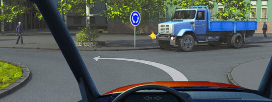 Ситуация на картинке из разряда повседневных: мы движемся по кругу, а другое авто хочет на этом круг въехать. Кто едет первым, а кто уступает? В разных условиях при круговом движении мы должны действовать по-разному. Условия определяются знаками приоритета, если нет светофоров или регулировщика, конечно. Сейчас в большинстве случаев в городах стараются планировать круговое движение так, чтобы движущиеся по кругу авто имели преимущество. Такое негласное правило вытекает из простой логики: так быстрее будет освобождаться сам круг. А если дать право приоритетного проезда въезжающим ТС, то круг быстренько забьется и встанет в мертвой пробке. Регламентируется подобная ситуация знаком "Главная дорога" с поясняющей табличкой, на которой круговое движение выделено жирной полосой, либо же знаком "Уступи дорогу" на въезде на круг с такой же табличкой. А вот в нашем случае такого знака нет, имеется лишь знак "Круговое движение", который не дает права приоритетного проезда. Поэтому здесь надо ру