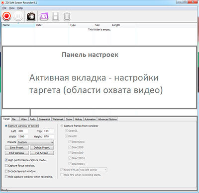 Перед записью видоса следует настроить программу, как вам удобнее. В коллекции настроек имеется область захвата, путь для экспорта файла, настройки видео, аудио, курсора, горячих клавиш, автоматизирование программы, а также другие настройки, о которых подробнее в конце статьи.