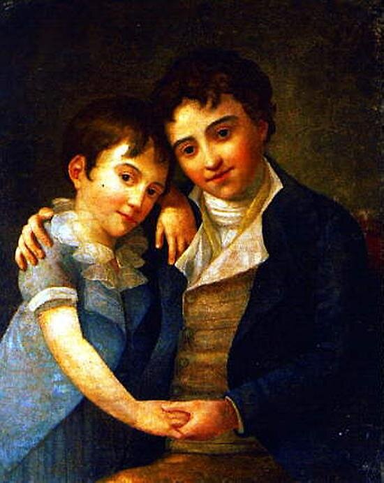 Проблема детей всех знаменитых людей в том, что им суждено до конца своих дней быть не самими собой, а потомками великих. Тень от фигуры родителя почти не оставляет им шанса на то, чтобы развернуть в полную силу свою индивидуальность. И это почти трагично. Лучше бы классикам не иметь детей, чтобы нам не видеть, как бесславно угасал их род. Дети Моцарта - характерный тому пример За девять лет брака у Моцарта и его жены Констанции родилось шестеро детей: четверо мальчиков и две девочки. Двое сыновей и обе девочки умерли почти сразу после рождения. В итоге после смерти Моцарта ( в 35 лет) его вдова осталась с двумя мальчиками на руках: старшему было 7 лет, младшему - 5 месяцев. Вот они спустя несколько лет после смерти отца. Слева - Франц Ксавер Вольфганг Моцарт, справа - Карл Томас Моцарт. На этом портрете хорошо видно, что оба сына Моцарта на него не похожи. Вот его детский портрет. Маленький Вольфганг был светловолосый и голубоглазый. Скорее, сыновья пошли в мать - яркую карегл