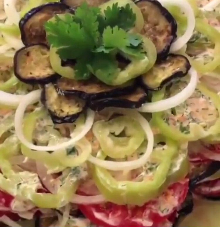 Иногда хочется что то вкусное и необычное. Именно тогда фантазия дает о себе знать. Причем с хорошей стороны! Игредиенты: Баклажаны солим и жарим с двух сторон. Помидоры, перец и лук режем кольцами. Марковь трём на мелкой терке, крошим укроп, давим чеснок к ним и мещаем со сметаной. Теперь, на широкую тарелку выкладываем слой баклажан, мажем соусом, далее помидоры, снова мажем соусом, потом лук, соус, перец, соус и по новой делаем соли пока все н закончится. Обычно у меня всего по два слоя получается. в конце можно украсить петрушкой. яПриятного аппетита, дорогие!