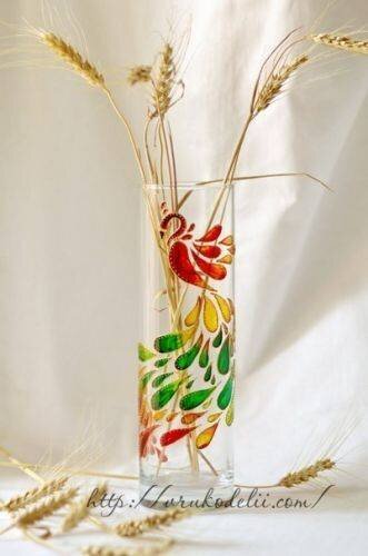На днях в интернете я увидела прекрасную вазу витражными красками, которую можно сделать самому. Хочу поделиться и с вами этим мастер классом. Самое основное здесь краски для росписи стекла, купить которые можно в магазинах для творчества. И потом творить и создавать прекрасные вещи! Не только вазы, но и бокалы, а также зеркала можно расписывать в такой технике. Нам понадобится: Для начала необходимо подобрать рисунок, который будем переносить на вазу. В данном мастер классе это вот такая прекрасная Жар-птица. Теперь перерисовываем рисунок на бумагу. Сворачиваем ее и прикрепляем скотчем внутри вазы.Поверхность стенок вазы необходимо обезжирить с помощью спирта. Теперь с помощью контура для стекла наносим рисунок. После того как контур чуть подсохнет, начинаем красками раскрашивать нашу Жар-птицу. Вот такая замечательная ваза у нас вышла! Не так уж и страшна роспись витражными красками, мастер класс в данной статье это отлично доказал. Не бойтесь творить!