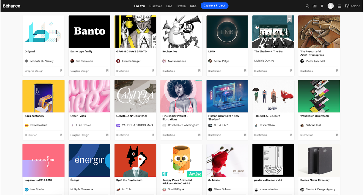 Если вы фрилансер творческой профессии в поиске вдохновения, признания или вакансии — обратите внимание на проект «Бихэнс». Это крупнейшее сообщество, где миллионы дизайнеров, иллюстраторов и фотографов размещают работы, делятся опытом, получают отзывы и комментируют работы коллег. В 2012 году компания «Эдоб» купила «Бихэнс» и интегрировала её со своим сервисом «Криэйтив клауд». Платформа поможет вам продать готовую работу или купить понравившуюся. В разделе «Джоблист» именитые компании Эпл, Амазон, Майкрософт, Эдоб, Букинг ищут себе сотрудников, хедхантеры известных российских компаний тоже заглядывают на «Бихэнс». В разделе «Курируемые галереи» найдёте лучшие креативные работы. Подпишитесь на интересующую вас галерею: «Графический дизайн», «Реклама» или наблюдайте за работами определённых личностей, нажав кнопку «Следить». Если владеете английским — смотрите обучающие прямые эфиры с известными дизайнерами, иллюстраторами и другими профессионалами, которые делятся полезными фишка