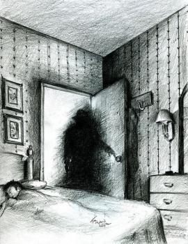 И вот я открываю глаза, лежу на боку напротив открытого дверного проема который ведет в длинный и темный коридор ( а дом у бабушки был довольно большой), я лежу и пытаюсь понять, почему так темно? Ведь по идее уже должно быть утро я обычно просыпался часов в 10 но темень была словно на дворе только час ночи. Через некоторое время я начала слышать какие то шаги, но шаги были странные словно кто то мокрыми ногами шлёпал по грязи, плюс начался раздражающий звон в ушах. Я подумал, что может это бабушка проснулась и там ходит и решил проверить, я хотел встать и включить свет но... Я не могла, я резко поняла, что просто не могу пошевелиться, ощущение будто я парализован, я просто лежал ни пальцем ни чем пошевелить не мог, меня это очень напугало, но то что было потом... Я думал я свихнусь.