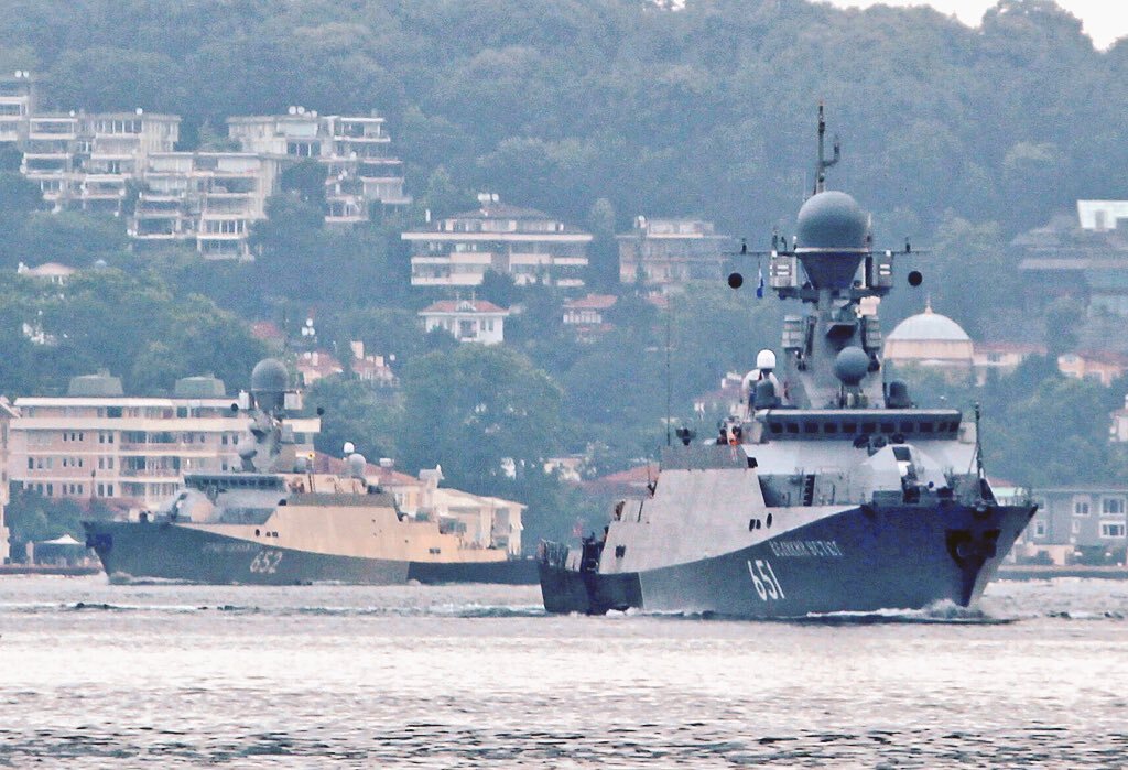Турецкие любители понаблюдать за судами в проливе Босфор сфотографировали проходящие в Средиземное море российские малые ракетные корабли "Град Свияжск" и"Великий Устюг". Оба корабля относятся к Каспийской флотилии ВМФ России. Корабли вышли из Севастополя 16 июня. Пока неизвестно, когда будет завершена боевая служба в Средиземном море. Вернутся ли они в Черное, а затем в Каспийское моря, или совершат переход в состав Балтийского флота, как это было с однотипными МРК "Серпухов" и "Зелёный Дол" также пока неясно. Для справки: "Град Свияжск" и "Великий Устюг" являются соответственно головным и третьим в серии МРК проекта 21631 "Буян-М" (заводские номера 631 и 633) и были построены АО «Зеленодольский завод имени А.М. Горького» в Зеленодольске. Головной МРК "Град Свияжск" был введен в состав Каспийской флотилии ВМФ России 27 июля 2014 года, а МРК "Великий Устюг" был введен в строй Каспийской флотилии 19 декабря 2014 года. Кроме них, в состав Каспийской флотилии входит также второй по счет