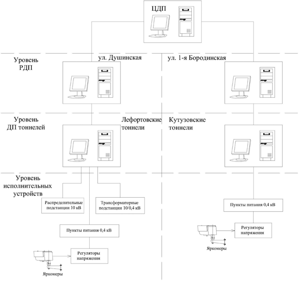 - второй (средний) – уровень районных диспетчерских пунктов (РДП). Служит для контроля и управления функциональным освещением тоннелей в штатном режиме. Может полностью контролировать и управлять всеми исполнительными пунктами при наличии связи с тоннелем;