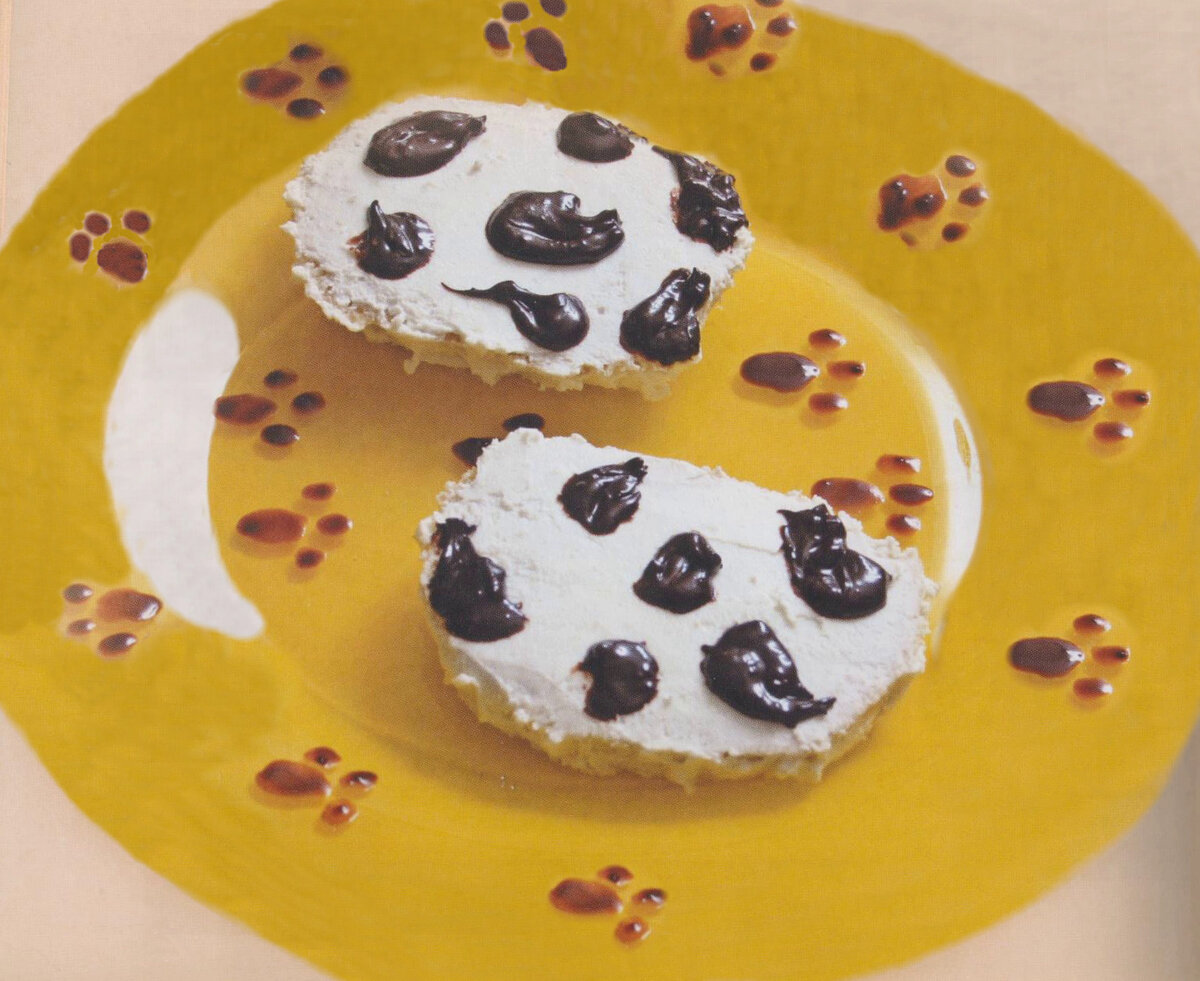 Ингредиенты: 1 белый батон или багет, 1 пакет молока, масло для сковороды, 100 гр. творога, 2 столовые ложки сахара, 2 столовые ложки сметаны, 1 шоколадка или 1 банка Нутеллы («Nutella») Способ приготовления: Батон или багет порезать на кусочки. Молоко налить в глубокую чашу и поместить в него хлебные кусочки, обмакнуть их с двух сторон, вынуть из чаши. На сковороде, смазанной маслом обжарить хлеб. После готовности выложить хлеб на плоскую тарелку. В отельной посуде смешать творог, сахар и сметану. Намазать бутерброды массой из творога, сахара и сметаны. Растопить шоколад и сверху творожной массы нанести шоколадные пятнышки, которые должны напоминать окраску далматинца. Тарелку можно украсить шоколадными следами. На заметку: Если шоколада нет, то можно взять баночку Нутеллы и украсить ею бутерброды или дополнить изюмом без косточек, который будет смотреться выразительно и красиво. Бутерброды «Кораблики» Ингредиенты: 4 листья салата, 4 яйца, 100 гр. твёрдого голландского сыра, 20 гр