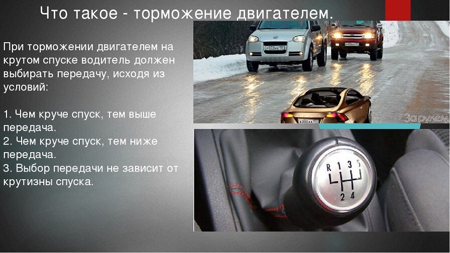 «Тормозить двигателем не только можно, но и полезно для автомобиля, . — Главное делать это без рывков и плавно, последовательно переключая передачи с высшей на низшую. Нельзя перескакивать через две и более передачи. Тогда нагрузки на трансмиссию будут в рамках нормативных величин и не повлекут снижения ресурса мотора и трансмиссии».