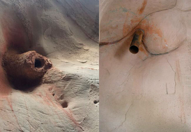 Еще с древних времен местным были известны три углубления в горе Байгуншань, но только один вход в пещеру остался не заваленным, и дожил до наших дней. Удивительно то, что через всю эту пещеру тянется несколько труб, которые вросли скалу и уходят в разных направлениях - к вершине горы и куда-то вглубь земли. Трубы разные в диаметре, от 2 до 40 см. Выглядят трубы очень ржавыми и производят впечатление каких-то останков древней системы. Всего на поверхности их обнаружено 12. По свидетельствам специалистов, трубы переплетены в сложную систему и имеют нео