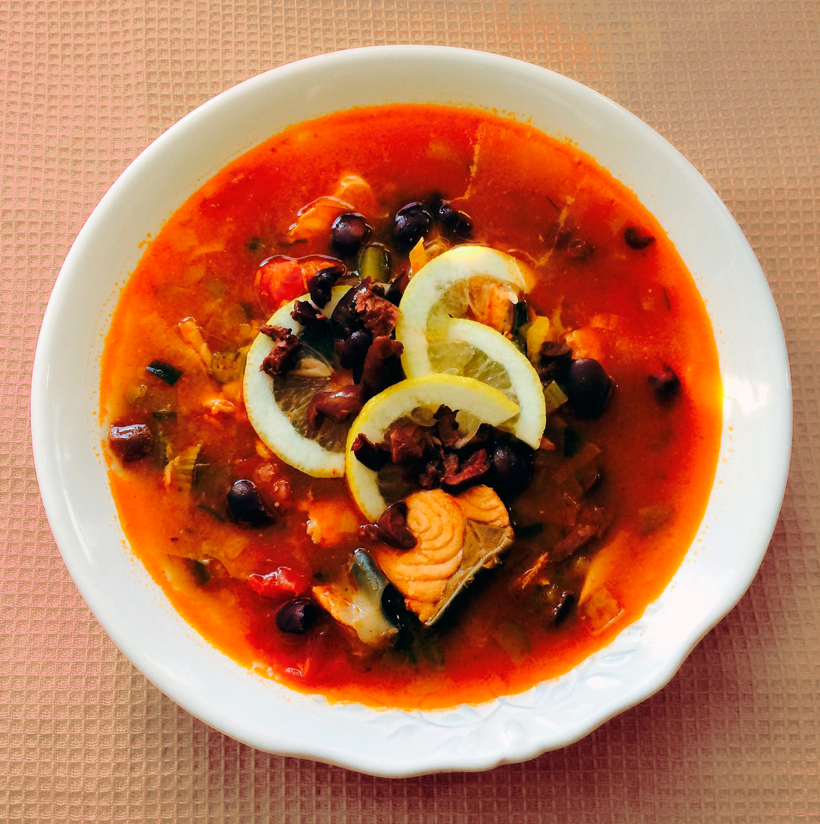 Солянка – это особенный суп, приготовленный на концентрированном бульоне: мясном, рыбном, грибном. В ее состав входят большое количество самых разнообразных мясных продуктов, или рыбы, или грибов, пассерованный репчатый лук, каперсы, маслины или оливки, соленые огурцы. В мясной солянке обязательно должен присутствовать томат-пюре. Количество ингредиентов дано на 5-6 порций. Для мясной сборной солянки сначала приготовьте 2 литра концентрированного бульона из говядины. Затем 2 соленых огурца очистите от кожицы и семян, нарежьте ломтиками или ромбиками и немного припустите в воде или бульоне. Далее 3 луковицы нарежьте соломкой и спассеруйте на сливочном масле (всего 60 г) с добавлением 100 г томат-пюре. Теперь приготовьте мясные наполнители: 250 г вареной говядины, 120 г вареных говяжьих почек, 100 г сосисок или сарделек, 100 г варено-копченого окорока или ветчины нарежьте тонкими ломтиками. Собираем солянку (не зря же она называется сборной). В кипящий бульон заложите подготовленные мясн
