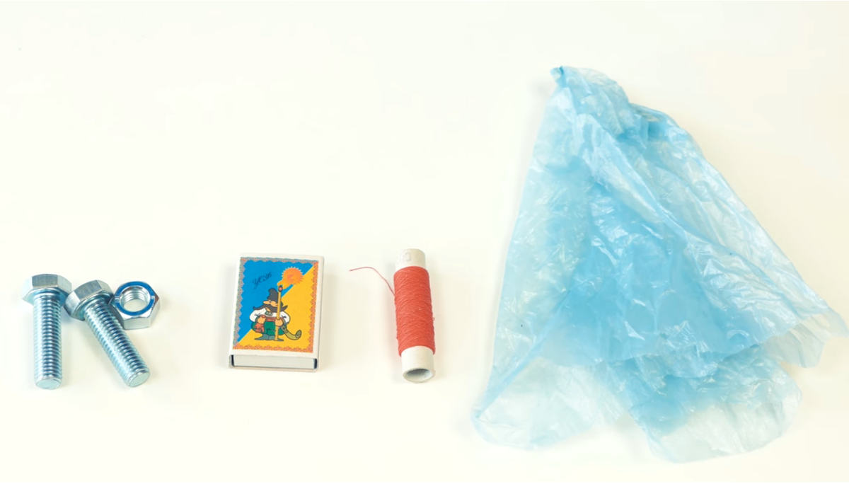 Сегодня мы покажем вам как можно сделать воздушную бомбу буквально за 5 минут Для это нам понадобится два болта, гайка, спички и целлофановый пакет Возьмем болт и немного прикрутим гайку. А в оставшееся пространство начистим спичечной серы. И прикрутим второй болт, что бы получилось вот так. Затем ниткой привязываем целлофановый пакет. Должно получиться так. Вот и всё наша воздушная бомба готова. Осталось только опробывать её для этого нужно просто подбросить всю конструкцию пакетом вверх и бежать, так как болты могут разлететься в стороны и попасть в вас. Помните, что эта бомба опасна и наша команда СТРОГО ЗАПРЕЩАЕТ пробовать её делать без защиты или сопровождения взрослых!!! Лучше посмотрите наши прошлые более безопасные самоделки.