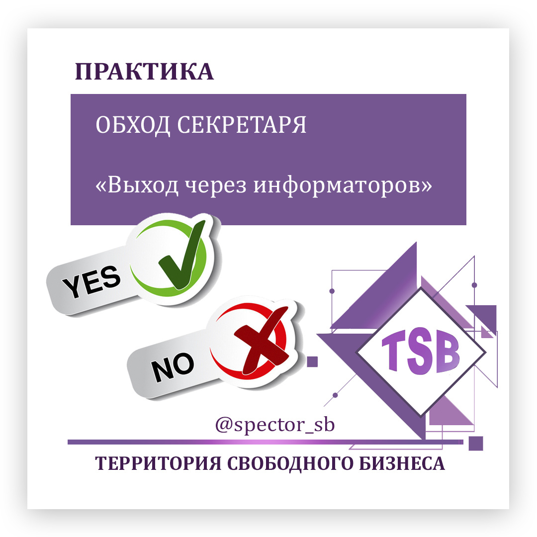 Что же делать если ни один из приемов, описанных ранее «Штурм» и «Союзник» не помогли? Есть еще один метод - «Обход» секретаря. Один из приемов «Выход через информаторов» Если прорваться через секретаря нахрапом не удалось или же руководитель очень высокопоставленный, оптимальной будет двухшаговая стратегия: 👉1. Первый звонок делаем «информатору», с которым нас без лишних вопросов соединят. Собираем у него всю нужную информацию. 👉2. Выходим на руководителя, используя знание его имени или ссылаясь на информатора. «Идеальный» информатор должен обладать двумя важными особенностями: ➖владеет достоверной информацией о ситуации, потребностях, планах организации ➖знает имена руководителей ➖владеет информацией о правилах работы с поставщиками ➖не ценит эту информацию и готов ею поделиться ➖с ним легко установить контакт Если речь идет о мелкой сделке, то можно узнать имя руководителя. Если о крупной, то необходимо собрать целый перечень информации, перед тем как выходить на руководителя