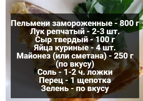 Очень простая,но в то же время и оригинальная запеканка у нас сегодня получилась! В ингредиенты применили многое что лежит в ваших холодильниках! Их час настал, можно приготовить такое чудесное блюдо!!! Обязательно поставьте мне оценку своими красивыми пальчиками палец вверх ☝)) Продукты: Приготовим: 1.Ставим разогреваться духовку до 200*С. 2. Чистим лук и обжариваем его на сковороде до красивого цвета. 3. На противень нальем масло,смажем и для нагревания в духовку(чтобы наши пельмени не прилипли). 4. Выкладываем в разогретую форму пельмени, потом выкладываем лук. 5. Готовим соус из сметаны,яиц и специй. 6. Выльем сверху и в духовку на 30-34 минут, сверху насыплем сыр и зелень! Приятного Аппетита!!! Попробуйте так же: Быстрые сырные лепешки Лепешки из 3-х продуктов Сыр домашний со специями Чипсы в микроволновке Печенье с кунжутом за 10 минут Королевская рыба Колбаса из куриц