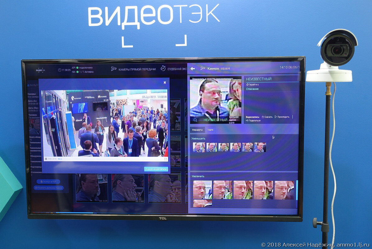 На стенде мне продемонстрировали, как моё лицо обнарживается в толпе людей, находящихся в холле ЦИПРа и за несколько секунд находятся все мои передвижения по выставке за два дня.