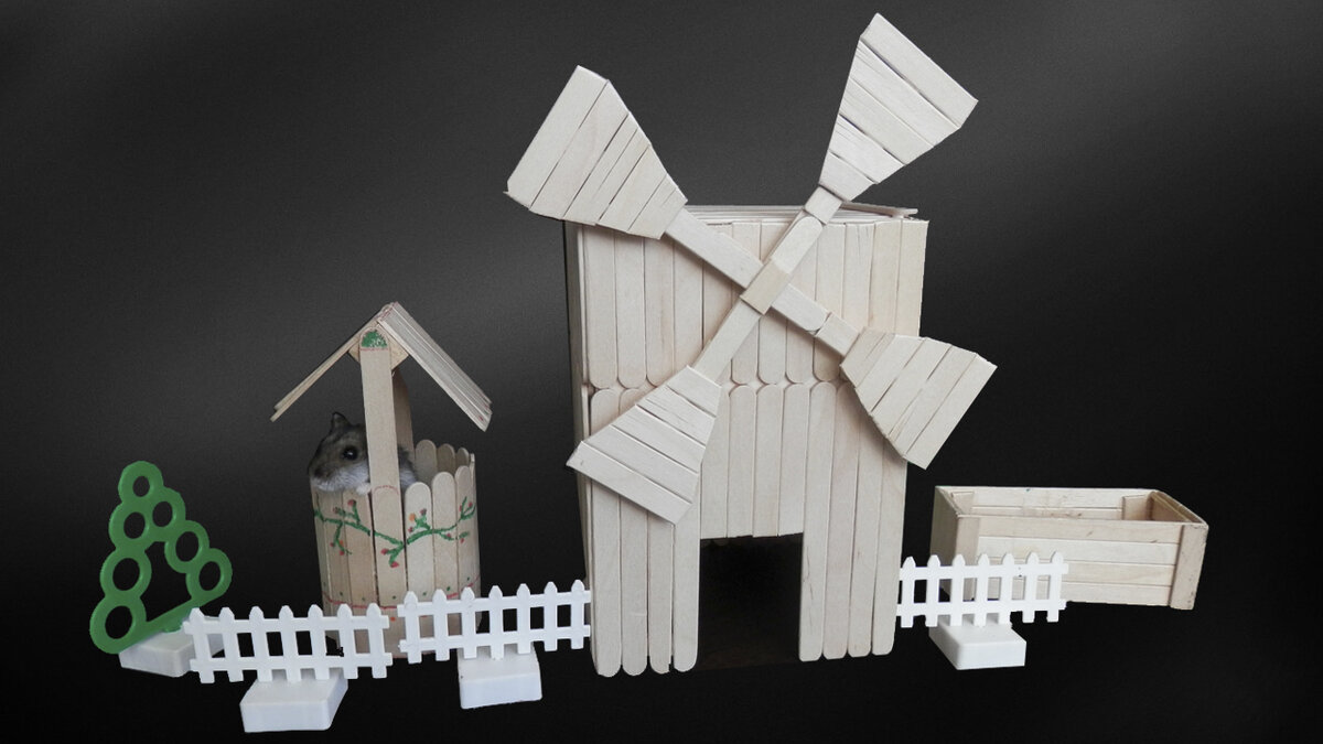 Сегодня мы своими руками сделали домик для хомяка мельница. Материал который мы использовали это палочки от мороженого которые склеивали с помощью клея ПВА. Дом для хомяка мельница отлично впишется в клетку или террариум для вашего хомячка. Этот домик для хомяка можно сделать очень просто. Так же дом можно использовать для декораици вашего интерьера