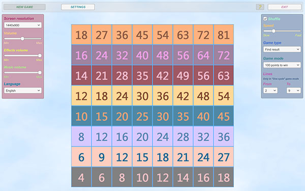 Для многих детей выучить таблицу умножения является делом не простым, но выучить для них это пол беды, так же надо не забыть и научится быстро умножать. И для того что бы помочь детям и не только им, выучить или потренироваться быстро умножать может пригодится программа тренажер умножения Multris. Тренажер умножения Multris сделан в форме игры похожей на тетрис, что делает процесс изучения и закрепления таблицы умножения более веселым и интересным. Игровой процесс, помогающий изучать таблицу умножения имеет два режима игры. В первом режиме, который называется «По примеру», в падающих в низ квадратах указаны примеры, которые нужно направить в соответствующие квадраты с ответами, и если ответ был правильным, он засчитывается, а если не правильным, то линия квадратов, в которые нужно направлять правильные ответы поднимется на одну строку вверх, тем самым сократив расстояние до верхнего уровня, что естественно уменьшает время на обдумывания. Во втором режиме который называется «По резуль