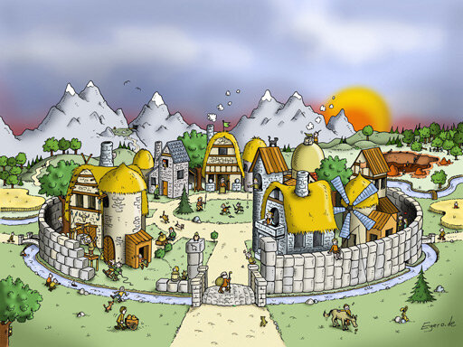 Деревня условно разделена на две области - кликнув мышкой на схематический вид своих ферм, вы проникните в поселение за защитной стеной, отделяющей ваши постройки и жителей от внешнего враждебного мира. Во внешней области строятся фермы, шахты и лесопилки. Во внутренней - здания экономической и военной инфраструктуры. С развитием главного здания- домика, в котором живут строители - время строительства всех построек уменьшается.