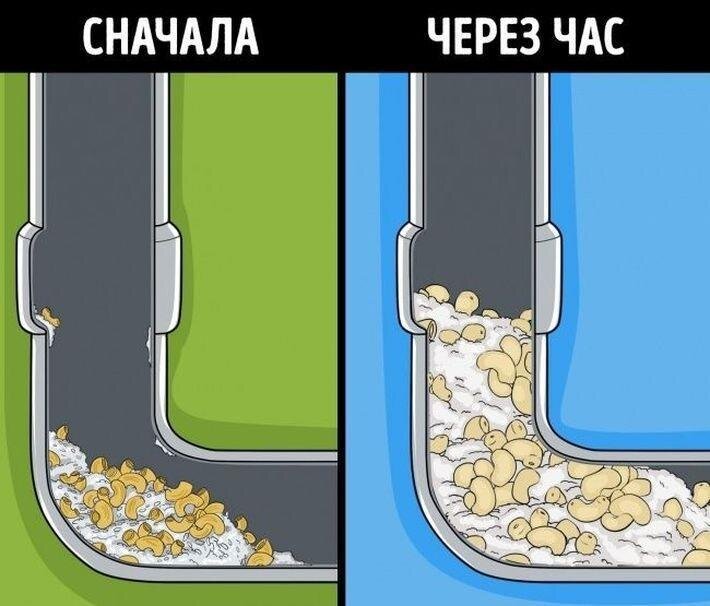 Макароны и рис со временем разбухают и приобретают гораздо больший объем. А на то, чтобы они растворились в воде, нужно очень много времени, поэтому засор гарантирован.