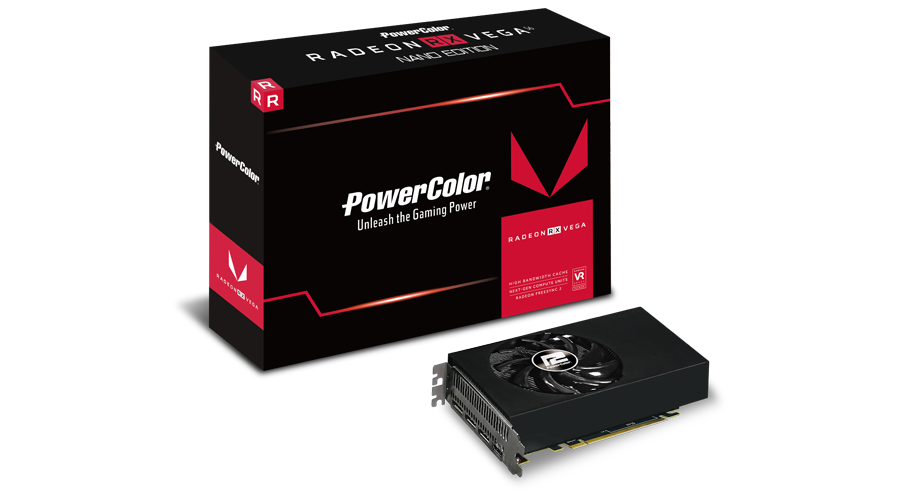 На выставке Computex 2018 компанией PowerColor была показана новая модель видеокарты RX Vega 56 Nano с GPU от компании AMD, которая выделяется компактными размерами: 170 × 95 × 38 мм, что позволит использовать ее в малогабаритных ПК формата Mini-ITX . Заявленные характеристики для столь некрупного графического ускорителя совсем не скромные: 3584 потоковых процессора, объем памяти HBM2 8Гб, работающих на частоте 800 МГц с разгоном до 1600 МГц. Частота самого же видеопроцессора достигает 1156 МГц, у GPU имеется турборежим, позволяющий работать на частоте 1471 МГц.