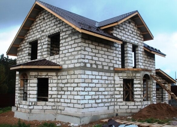 Если построить дом из дерева в одиночку практически невыполнимо, то из кирпича, пеноблоков и газобетона это вполне возможно. Не будем останавливаться на этапах создания фундамента и кровли – этому посвящены отдельные статьи. Здесь же будет затронут только порядок строительства коробки из газобетонных блоков. Средняя цена одного кубометра газобетонных блоков составляет от 3,5 до 4,5 тысяч рублей в зависимости от его марки. Исходя из этого стоимость строительства дома «под ключ» обходится в несколько раз дешевле, чем возведение такого же дома из бруса или кирпича. Также получается большая разница по себестоимости работ. И еще немного о газобетоне. Современный спрос на данный строительный материал объясняется его высокой энергоэффективностью, небольшой массой и технологичностью обработки. В сравнении с его основными конкурентами, керамическим кирпичом и пеноблоком, объемный вес ниже в 2-4 раза в зависимости от марки газобетона. Газобетон – великолепный теплоизолятор. Его коэффициент теп