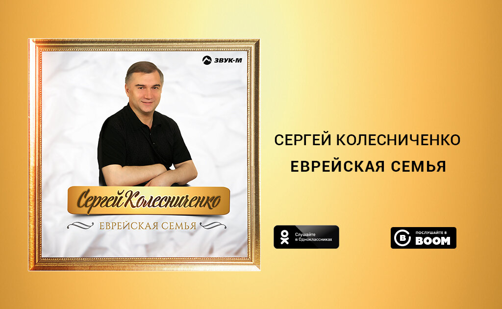 Исполнитель: Сергей Колесниченко Название: «Еврейская семья» Жанр: шансон Послушать и скачать: на всех крупнейших музыкальных сервисах, в том числе: iTunes, Google play, Apple music, Музыка Билайн, Яндекс.Музыка, а также — в приложении BOOM (для пользователей социальных сетей Вконтакте и Одноклассники).