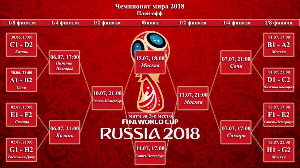 Кто с кем будет играть по окончании группового этапа чемпионата мира по футболу 2018 в России. Расписание матчей, места и время проведения встреч. Старт стадии матчей на вылет начнётся с 1/8 финала 30 июня и завершится финалом 15 июля. Посмотреть итоговые турнирные таблицы в группах можно здесь. Все города и время начала матчей. Пары 1/8 финала и результаты завершившихся матчей. Пары 1/4 финала чемпионата мира 2018 14 июля за третье место играют: Бельгия - Англия. 15 июля финал: Франция - Хорватия.