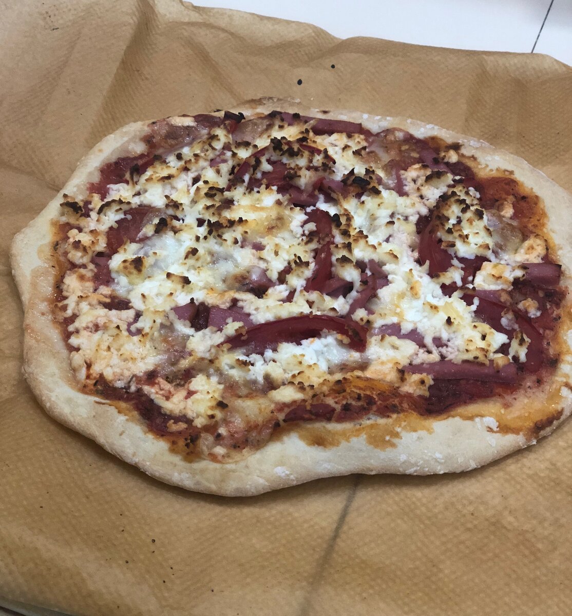 Эта пицца получается очень тоненькой, хрустящей, попробуйте обязательно ее приготовить! 0,5 кг муки 275 мл воды 25 мл оливкового масла 6 г сухих дрожжей 10 г соли Муку+соль+дрожжи смешиваем в глубокой емкости и перемешиваем венчиком, выливаем сразу всю воду, вымешиваем тесто очень хорошо в течении 5-7 минут. Я обычно вымешиваю на столе, так удобнее, когда тесто перестало приипать к рукам, добавляем оливковое масло, далее формируем в шар и перекладываем в посуду в которой изначально все замешивали, накрываем чистым полотенцем и убираем на пару часов, чтобы оно поднялось. Когда наше тесто подошло, формируем из него несколько шариков весом 180-200 грамм. Убираем под полотенце, пусть ждут своего часа) Соус для пиццы 1 пачка пробитых томатов Орегано, соль, перец, чеснок, базилик, оливковое масло по вкусу. Включаем духовку на самую максимальную температуру. Раскатываем тесто, ну а далее собираем пиццу по своему вкусу. Я Вам рекомендую сразу тесто переложить туда где планируете выпек
