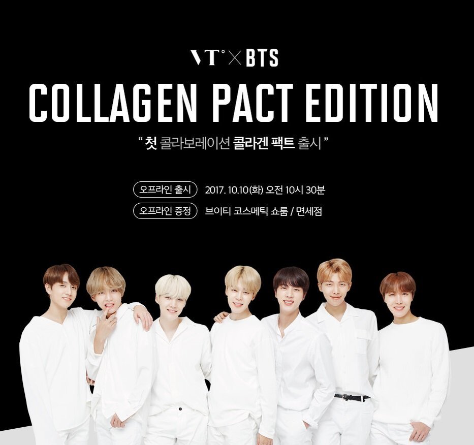 BTS являются моделями корейского бренда косметики VT Cosmetics и запускают новую серию коллагеновой косметики. Новая коллекция представляет собой специальный набор коллагеновой косметики, выпущенная в белом и черном цвете. Косметика с функцией SPF 50 PA+++ защищает кожу от пятен, морщин и насыщает ее коллагеном, делая ее еще более молодой и нежной. Подарочный набор включает в себя эксклюзивную упаковку и изображением BTS, наклейкой, дизайн разработали сами участники и индивидуальные фотографии участников. Участники поделились своими мыслями во время фотосессии. РМ: "Это был чувственный момент" Джин: "Я очень старался выглядеть красивым и это было трудно" Шуга: "Фотосессия была очень классной" Джей-Хоуп: "Для BTS большая честь стать рекламный лицом новой линии косметических средств VT Cosmetics" Чимин: "Я все еще пытаюсь найти лучший способ показать себя" Ви: "Если подвести итог, то все прошло хорошо" Чонгук: "Я был очень рад позировать для рекламы" К сожалению данная косметическая п