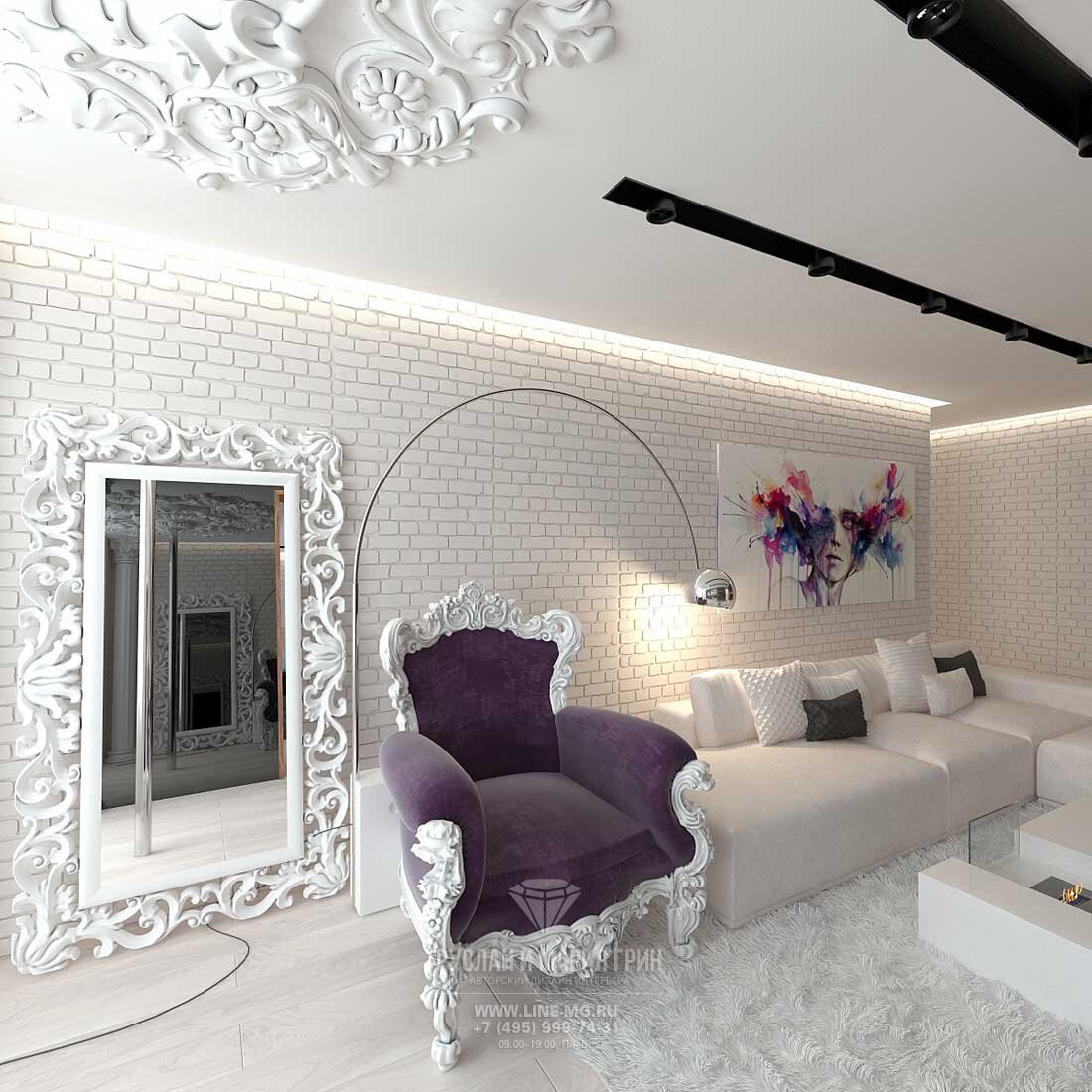 Ремонт такой гостиной в стиле минимализм не потребует от вас королевской щедрости. Белая кирпичная кладка, качественный ламинат, лаконичный потолок почти без декора — такая отделка при всей своей бюджетности формирует ощущение безграничной свободы. Светлый монохром зрительно расширяет пространство. Угловой диван и столик с камином — дань стилю минимализм с его строгими геометрическими формами. На фоне белого цвета несколько абстрактный портрет девушки и артистичное лиловое кресло выглядят яркими колористическими пятнами, оставленными художником на холсте. Авторский стиль дизайнеров Руслана и Марии Грин здесь весьма отчетливо проявился в желании разбавить минимализм элементами классики в виде колонн и потолочной лепнины. Некоторую обескураженность может вызывать также танцевальный шест. Однако в итоге мы понимаем, что этот элемент — такая же неотъемлемая часть дизайна гостиной, как и стилистически выбивающееся кресло.